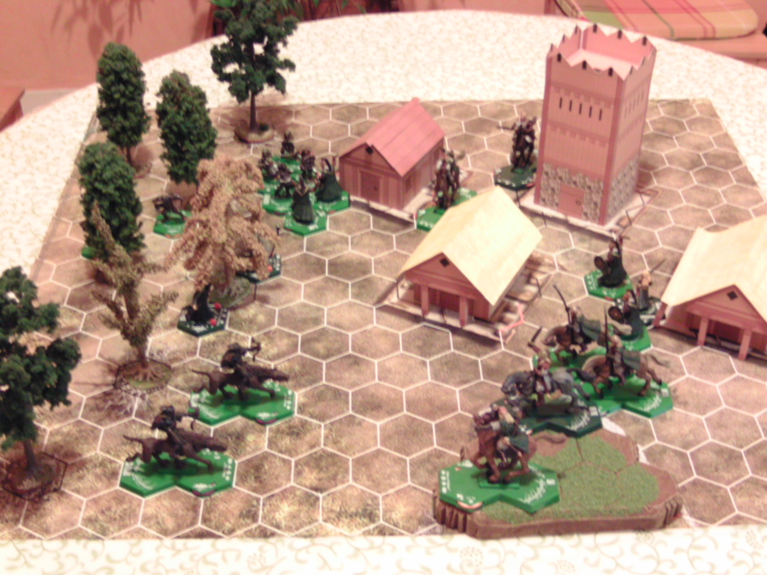 | C'est joli, mais est ce que les différents niveaux ne sont pas gênants avec les figurines de plusieurs hexagones, et les arbres, ne gênent-ils pas les trolls ou les fellbeasts? Sinon, j'ai aussi eut l'occasion de jouer une partie à 40.000 pour chaque camp (les règles avaient encore une fois étés modifiées par Taiko) avec des décors et ça a donné un gros truc fandar, absolument injouable, on était 4 à jouer chaque camp, 3 colonels et 1 général de chaque côté, injouable, mais amusant.
