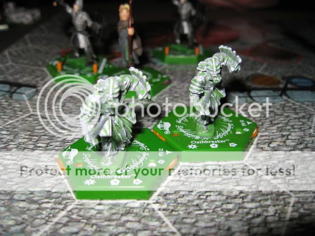Car l'elfe de la Lorien ne va pas survivre au tir de mon premier TT032. Il n'aura donc pas la possibilité de réaliser un dernier coup rapide Sur l'autre bord de la carte, Troll lance ses forces à l'assaut de mes tireurs embusquée dans la tour. Notamment deux Oathbreakers qui traverse le champ de bataille grace à la compétence rapidité.