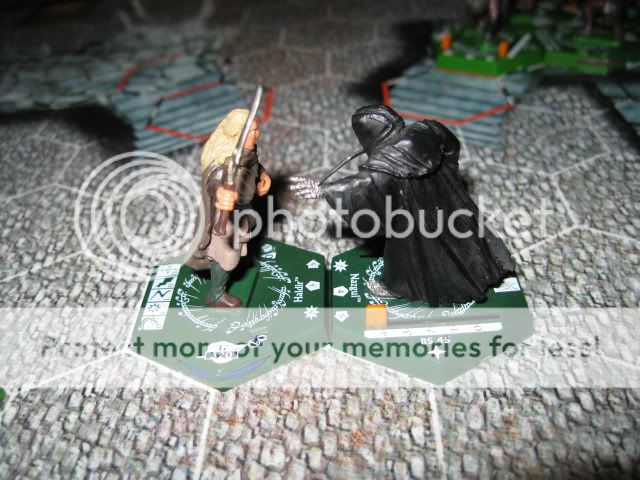 Deux troublions vont intervenir dans ce combat épique! Tout d'abord mon BS045 qui d'une force magique bien placée, va obliger Haldir à venir se positionner dans la ligne de mire de 3 de mes TT032. Puis Gandalf qui va achever promptement d'un tir efficace le pauvre Moria Goblin Champion.... Mon Nazgul va ensuite venir au contact d'Haldir pour l'obliger à dépenser un point d'action pour activer courage. (Terreur)